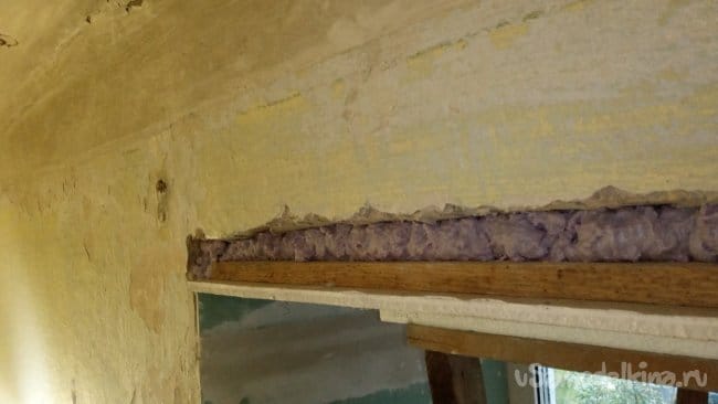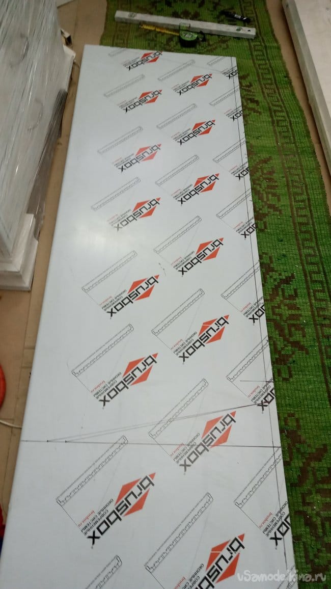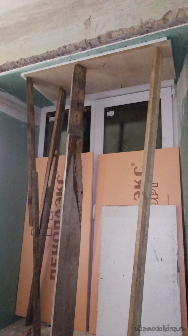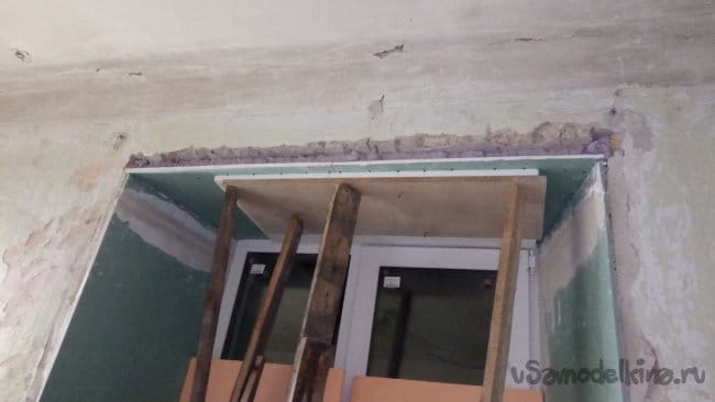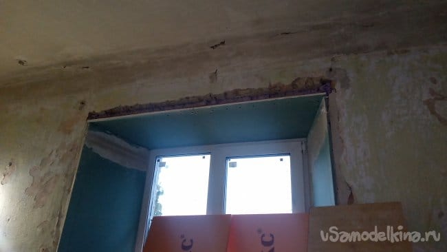 Теперь нужно что-то сделать с верхней плоскостью... Там получилась уж больно большая полость, потому что старые откосы были "раструбом" во всех трёх плоскостях. Я же хочу сделать верхнюю плоскость в горизонтальном уровне. Ведь, на количество попадающего в комнату света это не повлияет.