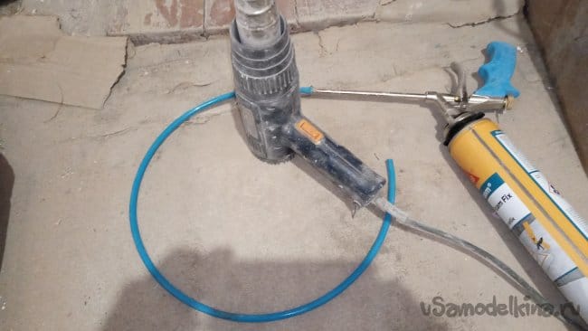 Занялся подготовкой подоконника. Так как окна высокие, не исключена вероятность того, что кто-то когда-то залезет на подоконник с ногами (например, штору вешать). Поэтому я решил его укрепить, закачав во внутренние каналы монтажную клей-пену. Так как длина каналов более метра, сделать это обычным пистолетом не получится. Я удлинил его, использовав обрезок пневматического пластикового шланга: