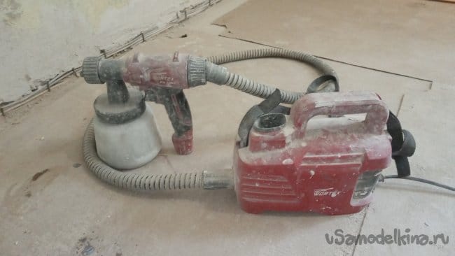 Сначала я прогрунтовал стену, чтобы скрепить внешний слой и "склеить" всю пыль. Это очень легко делать при помощи электрического краскораспылителя: