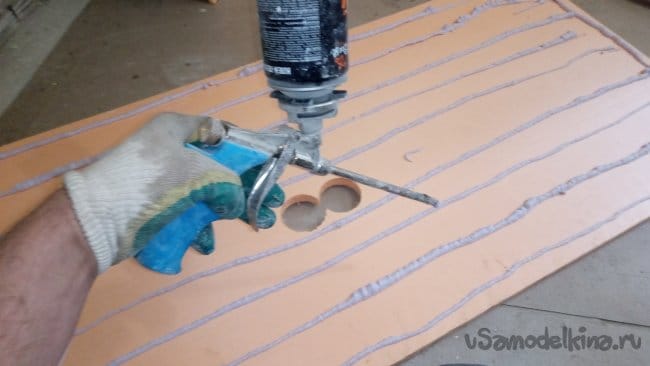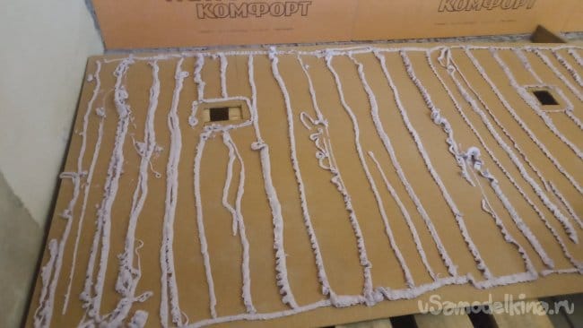 Их я располагал вертикально, перпендикулярно приклеенным ранее листам ДСП. Закреплял их не только клеем, но и шурупами: