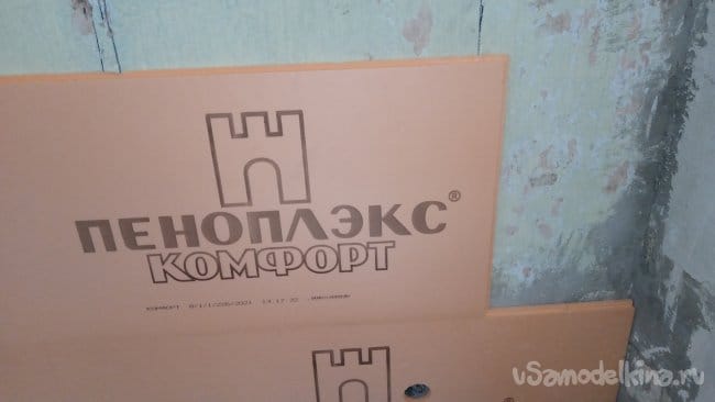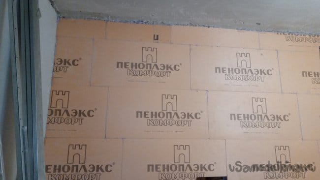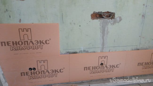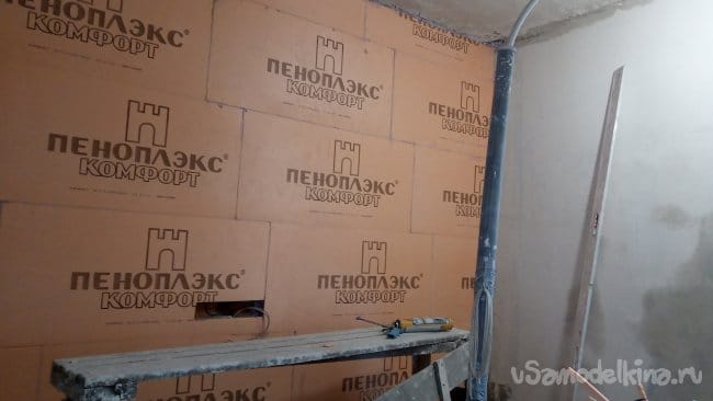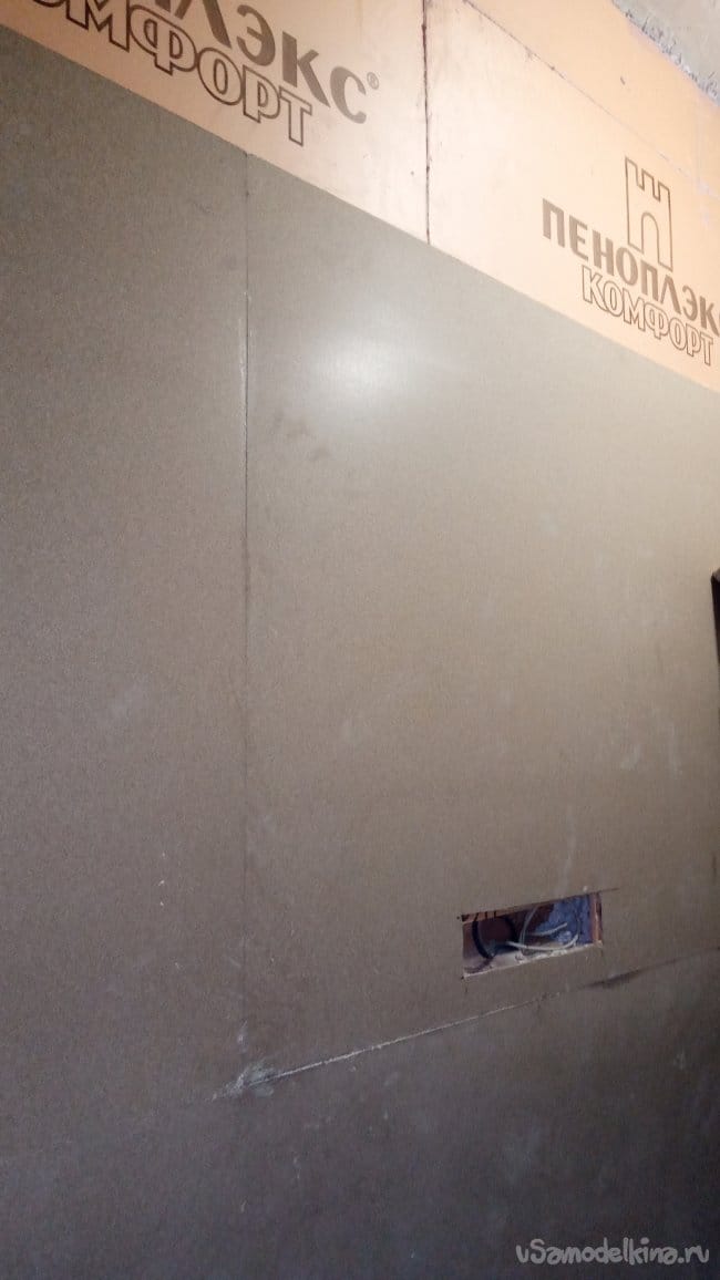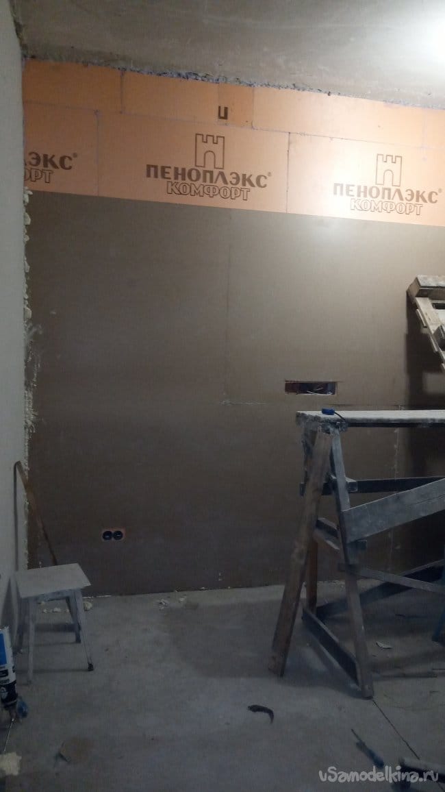После того, как грунтовка впиталась и высохла, начал обклеивать стену экструзионным пенополистиролом: