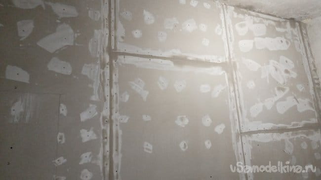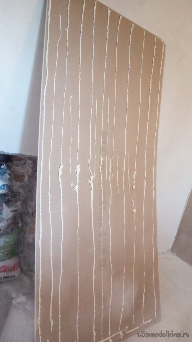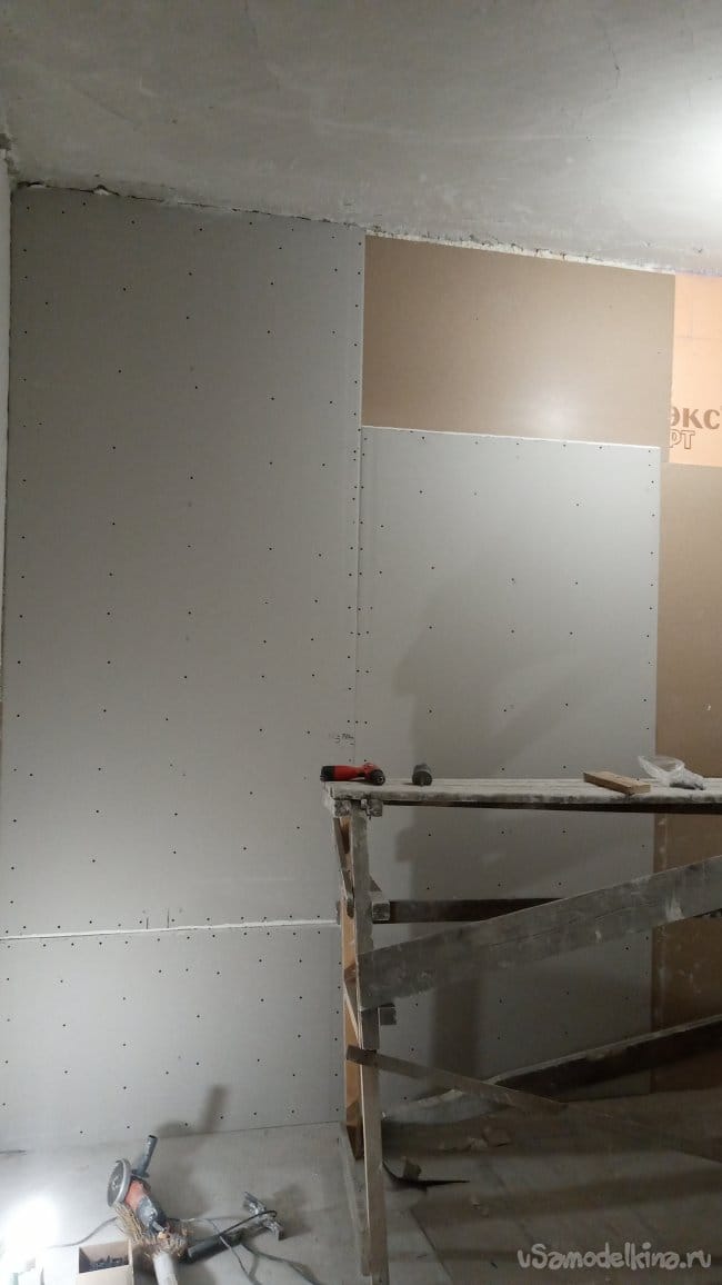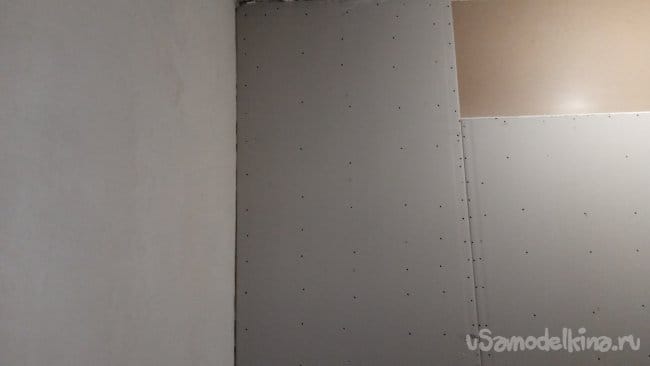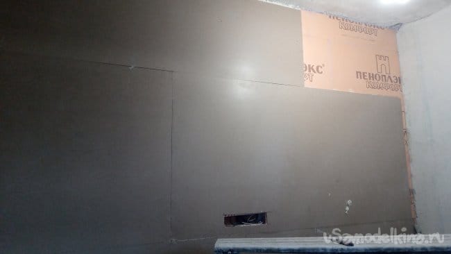 После застывания клея (благо, этот процесс много времени не занимает), я снова тщательно запенил все щели и сразу-же приступил к приклеиванию гипсокартонных листов: