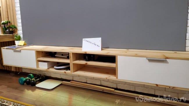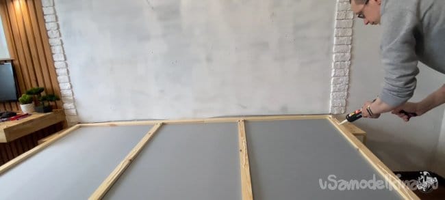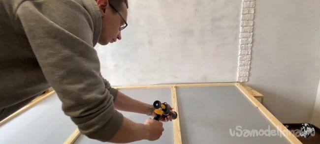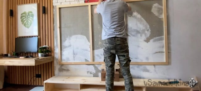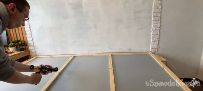 Крепим экран на стену. Конструкция получилась не очень тяжёлая и жидких гвоздей хвати, чтобы удержать её. Промазываю все плоскости рамки и прижимаю её к стене. Для надежности я прижал все конструкцию к стене гантелями!