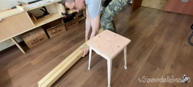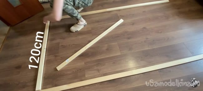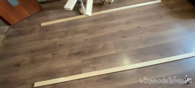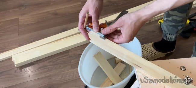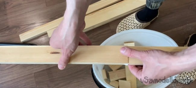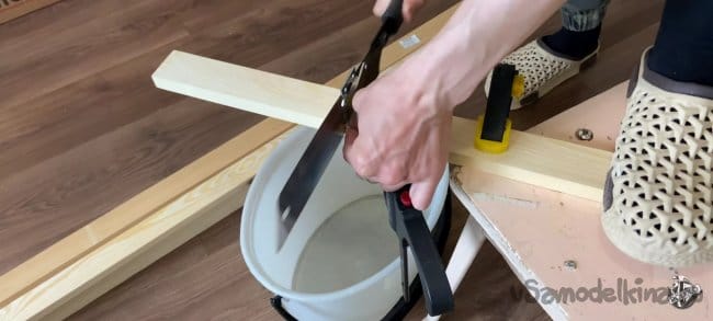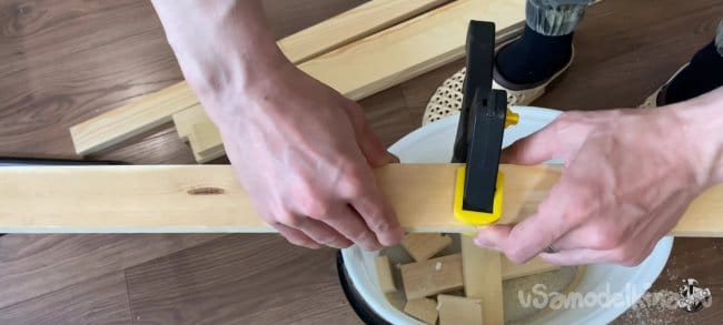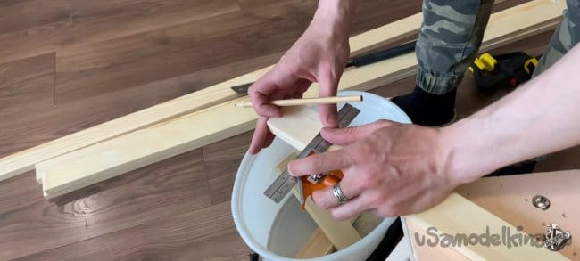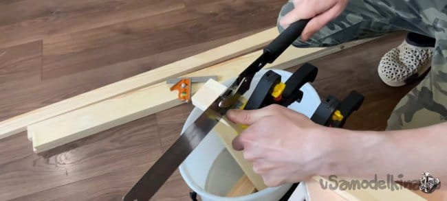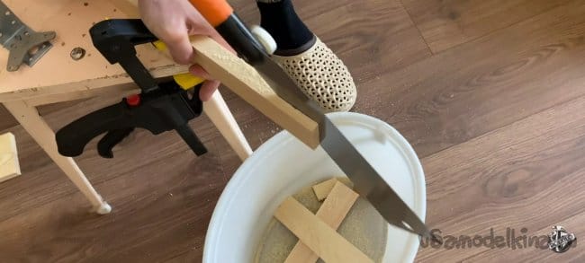 Беру нужный брусок, размечаю на нем 40 мм по длине и 9 мм по толщине. Аккуратно пилим. После распила можно обработать края канцелярским ножом, для лучшего прилегания. Повторяем операцию на остальных трёх брусках.