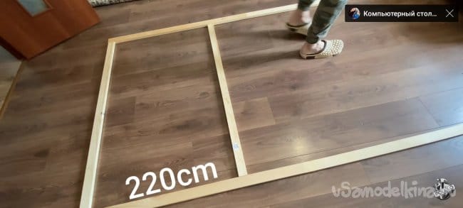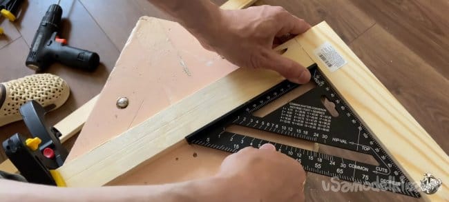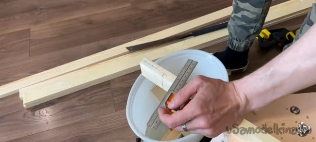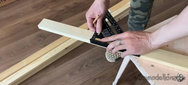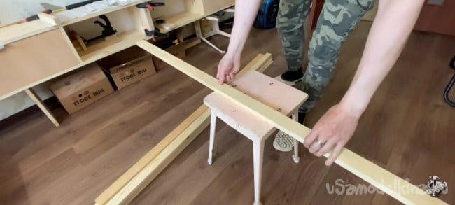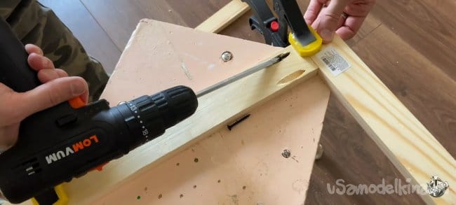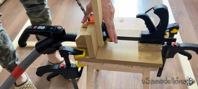 Пока клей сохнет можно заняться остальными частями рамки для нашего экрана. Отпилим четыре бруса длинной 840 мм. Сверлим в каждой заготовке отверстия под косой шуруп. Я использую специальный кондуктор и приспособление которое сделал сам.