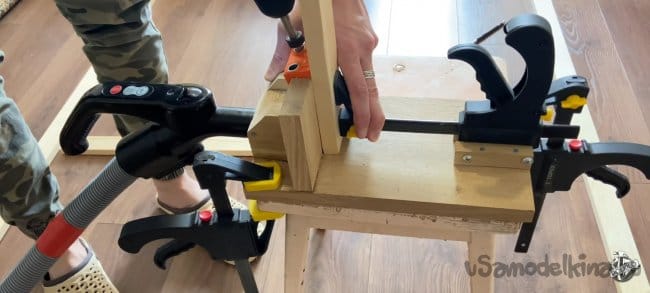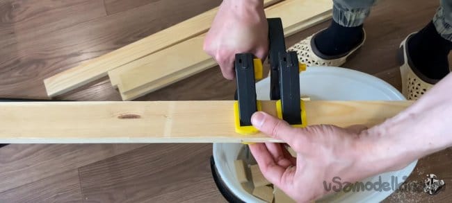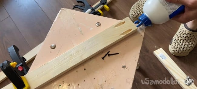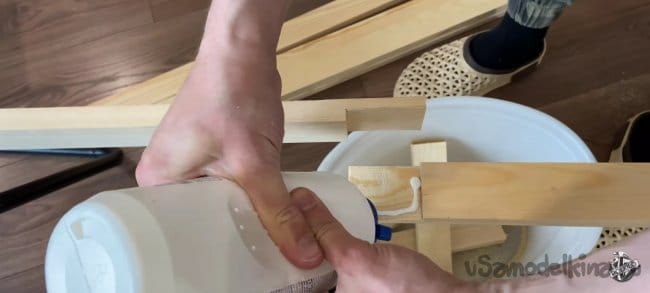 Соединяем наши бруски вместе. Промазываем места соединения клеем ПВА фиксируем с помощью струбцин. Для большей надёжности в каждом месте соединения я добавил по 2 скобы. Электрическим степлером.