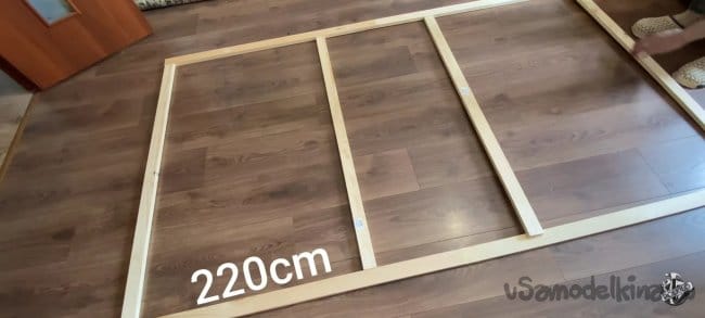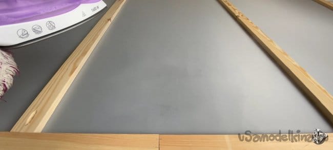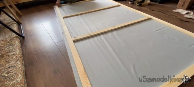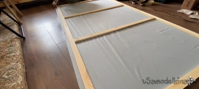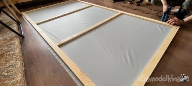 Кладём ткань на пол и накрываем нашей рамкой. Процесс натяжки не очень сложный, но ответственный! Подворачиваем края на длинной стороне и крепим их к каркасу с помощью электрического степлера. Вы можете натягивать с любой стороны, но всё время следите, чтобы не образовывались складки. После натяжки я увидел, что остались загибы на ткани. Их легко можно убрать с помощью пара или фена.