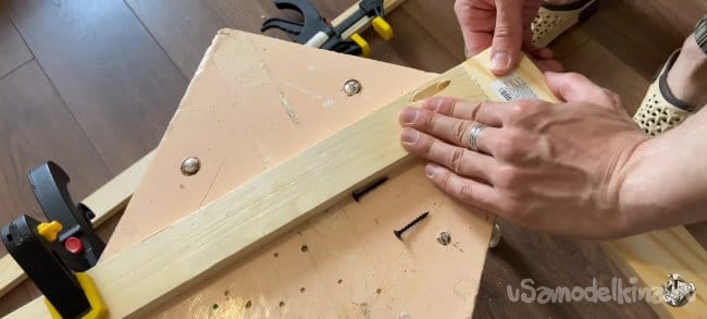 Теперь нужно всё собрать вместе, это проще простого проклеиваем место соединения клеем ПВА и закручиваем в наши отверстия шурупы. Вот и всё! Не забывайте проверять правильность угла в местах соединения. Должен быть ровно 90 градусов иначе нашу рамку перекосит.