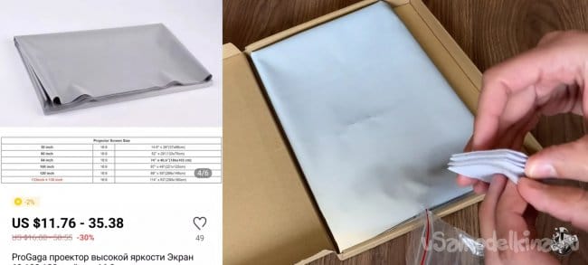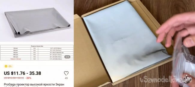 Я купил специальную светоотражающую ткань на алиэкспресс. Вы можете поступить так же или использовать любую другую ткань. Хочу сразу предупредить по поводу этой ткани. Она работает очень хорошо картинка яркая и насыщенная. Смотреть комфортно даже при свете дня (конечно если не очень яркое солнце). Но есть нюанс, который может многим не понравится. Когда вы используете обычную белую ткань (к примеру хлопковую простыню) угол обзора достаточно широкий, но картинка не яркая и не чёткая. В случае светоотражающей ткани всё наоборот. Угол обзора становится узким, но картинка четкая и яркая. Выбирать вам!