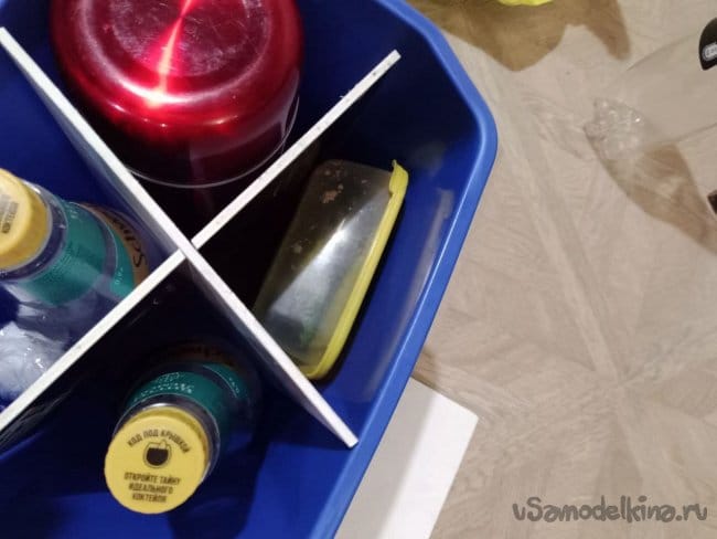 Так как раньше я катался один, то пассажирское сиденье всегда было в моём полном распоряжении, я там раскладывал своё дневное меню и по мере желания ел. Частые подсадки пассажиров начали меня подбешивать, главным образом тем, что приходится собирать свою еду, пувер-банк, сигареты и девать их в недоступоное место, и наводить порядок на пасс. сиденье, вытряхивать крошки от пряников. После нескольких поездок я понял, что мне необходима коробка, в которой будет лежать мой дневной рацион, чтоб дали пассажира – коробку переложил назад без суеты. Высадил пассажира – коробку обратно. Но размышления и личный опыт подсказали, что при торможении коробка, лежащая на сиденье, перевернётся, а содержимое высыпется в ноги. Значит, коробка должна сразу стоять в ногах. Замерил, между сиденьем и торпедо 28 см. Редкая коробка имеет такие размеры. Подумал я и о будущем, осень-зима впереди, дожди будут, а потом снег, значит, картонная коробка расклеится. Вывод: коробка должна быть пластиковой и желательно с крышкой и ручкой для переноски. Сходил на мой любимый балкон и разыскал там отличное пластиковое ведро подходящего размера, 25 см, оно без проблем поместится между сиденьем и панелью. Но если просто наложить в ведро мои пакетики, свёртки, термос, воду, сигареты, то сложно потом это достать на ходу, как иногда приходится. Разделим мы ведро на секции, как коробку с бутылками.