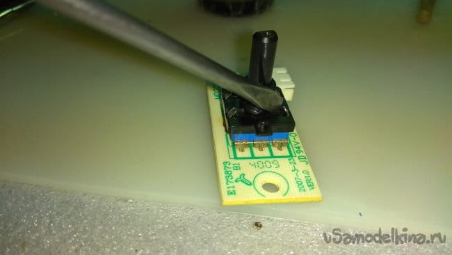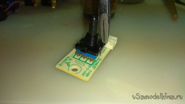 Энкодер разбирается сверху, это удобно, не придется выпаивать. Отогнул крепление отверткой и выровнял зажимом, снял верхнюю часть.