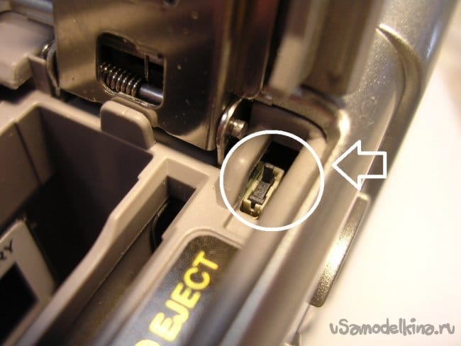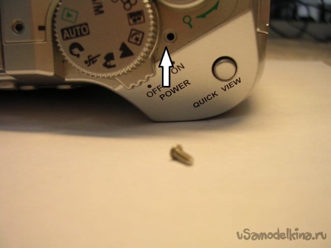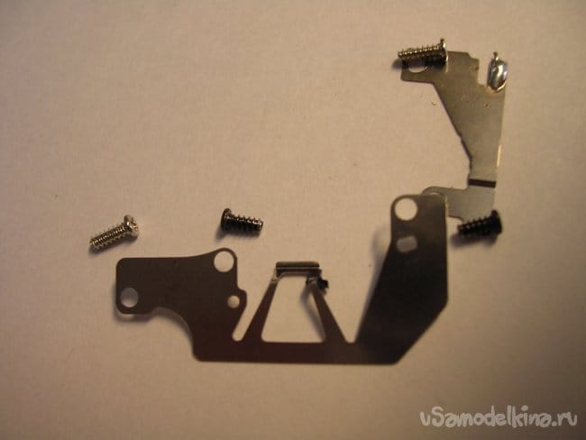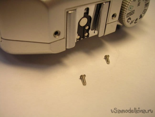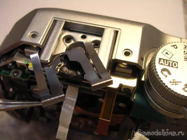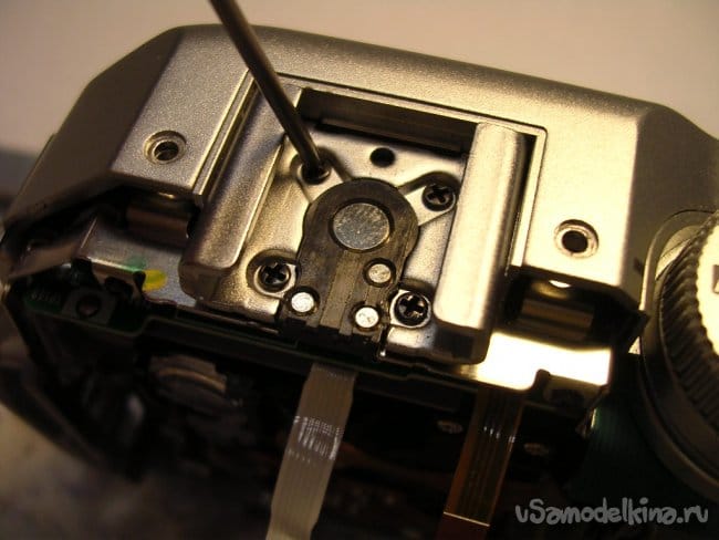 Для продолжения разборки нужно снять «горячий башмак» с верхней панели корпуса. Для начала отгибаю пружину, фиксирующую внешнюю вспышку. И сдвигая её назад, снимаю. Под пружинкой винты крепления башмака к корпусу. Иногда возникает неконтакт в этом узле, потому, что ослабевают винты его крепления, и внешняя вспышка не работает. Это можно исправить самому, достаточно снять пружинку и затянуть болтики.