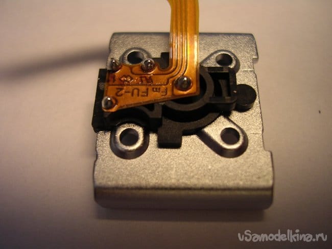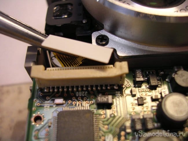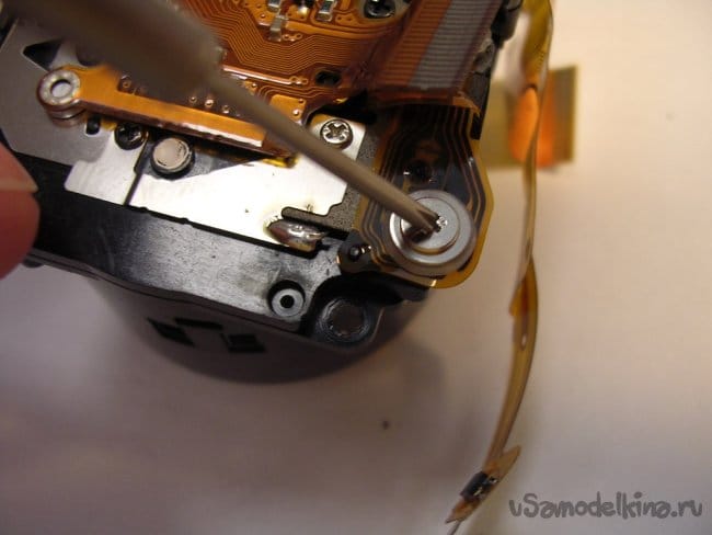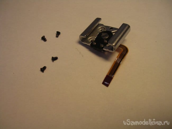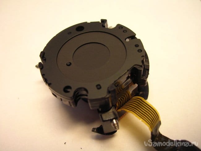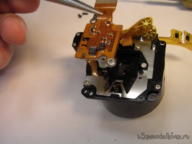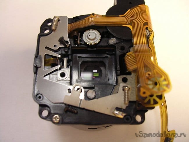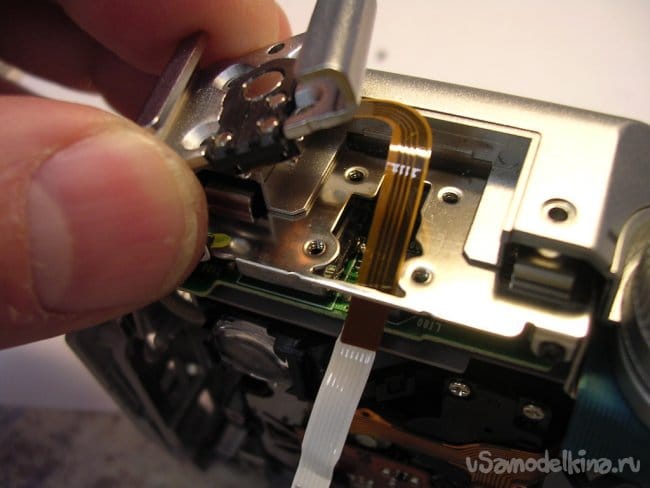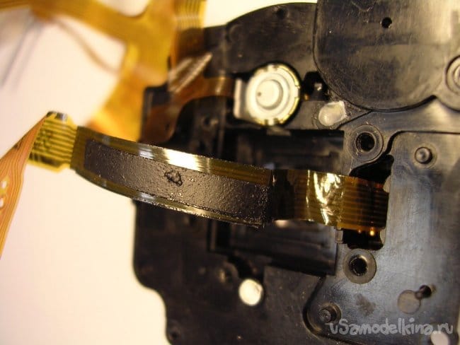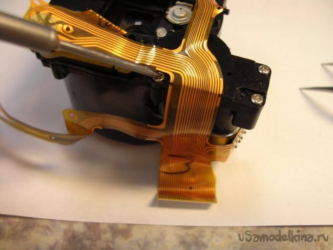 Извлекаю опору шлейфов управления блоком диафрагмы и затвора. К этой железяке они приклеены на двойной скотч и еще склеены между собой, действовать нужно очень осторожно.