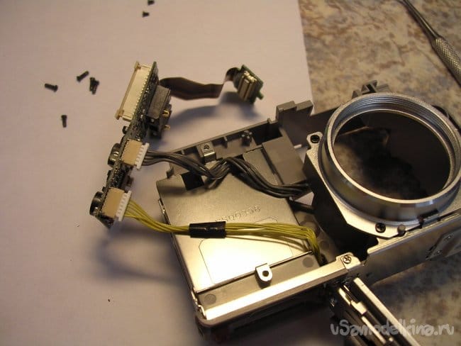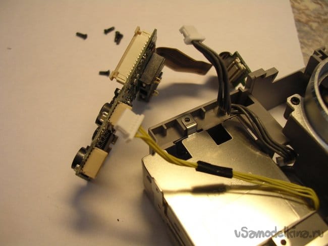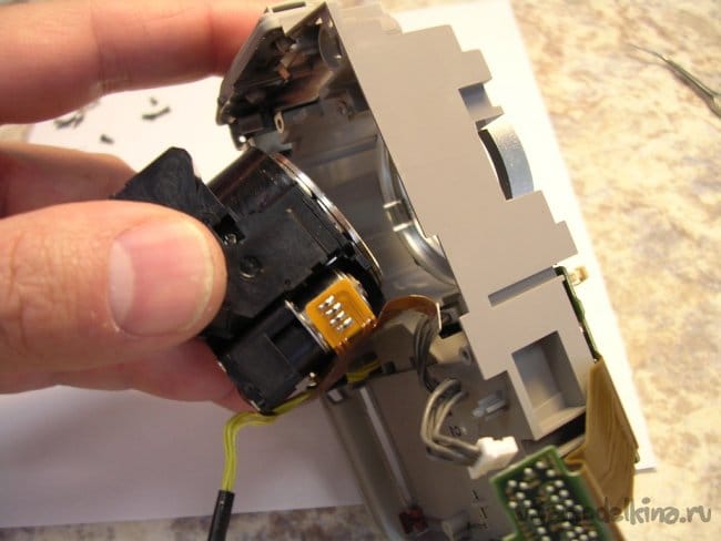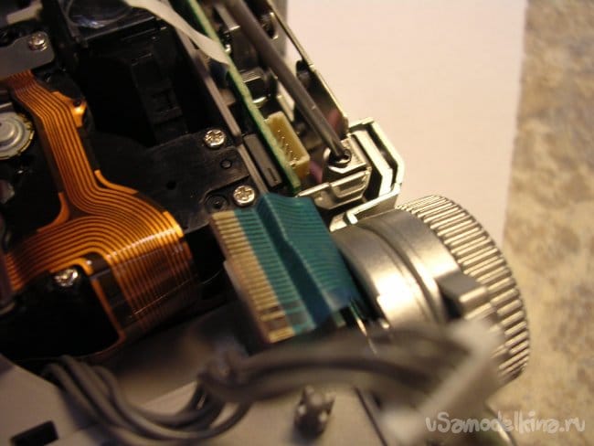 Пробираюсь к объективу, он закреплен на фронтальной панели корпуса. Откручиваю винты крепления и рассоединяю блок накладных контактов шлейфов управления.