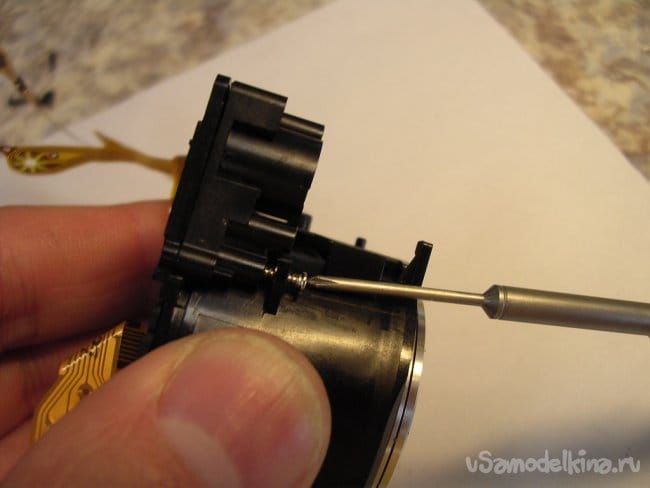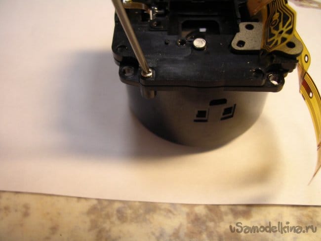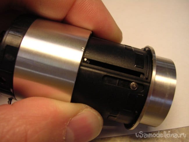 Разборка продолжается, снимаю первый крепежный баррель объектива, установленный на довольно больших винтах крепления.