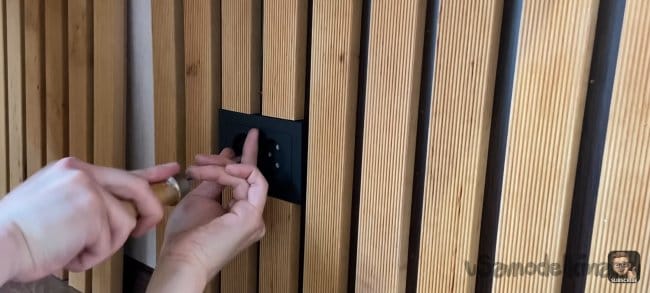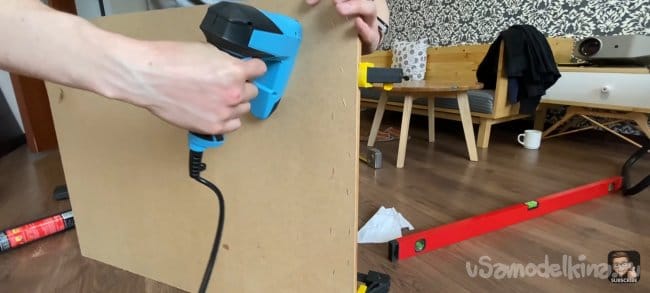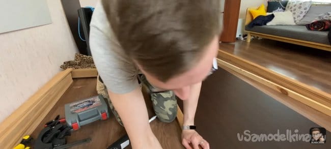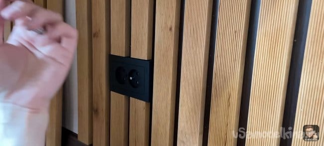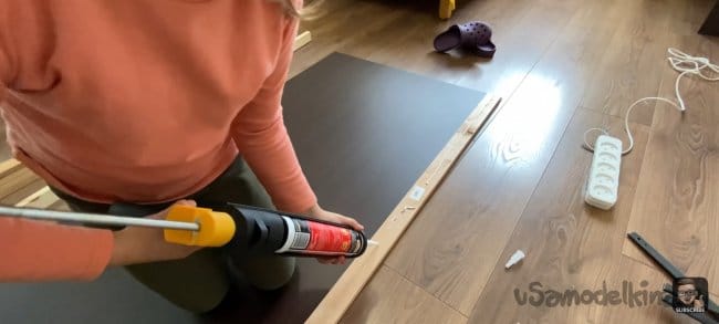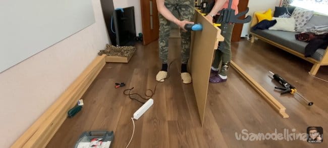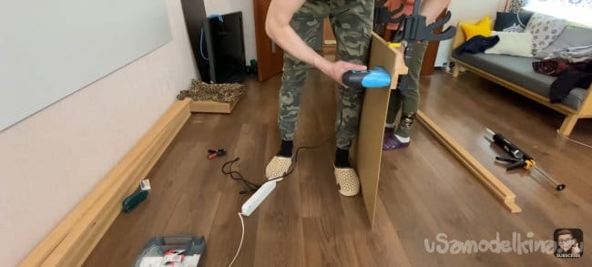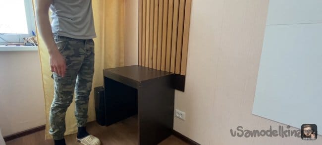 Я хотел сделать стену и стол единой частью интерьера, поэтому мне нужно было разделить панель. После фиксации большей части и стола, измеряем размер маленькой панели и уже по отработанной схеме собираем её. Под столом будет розетка для подключения электроники, я предварительно вырезал для нее отверстие.