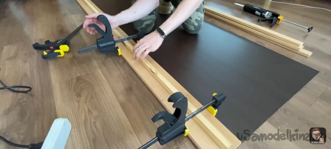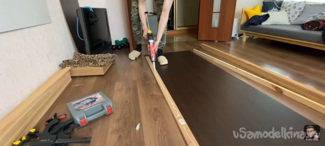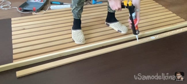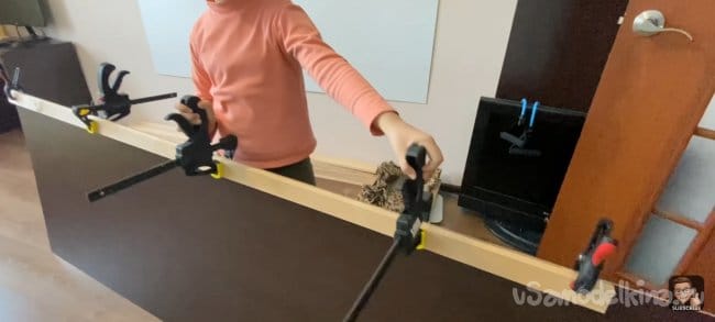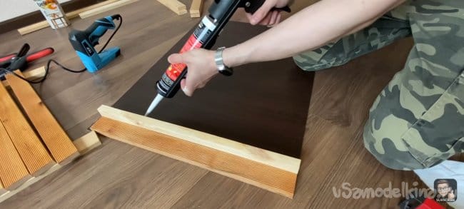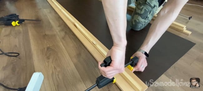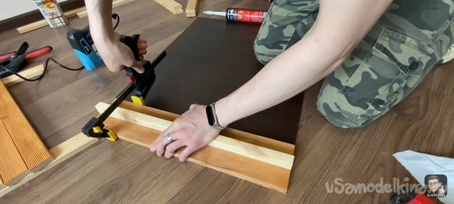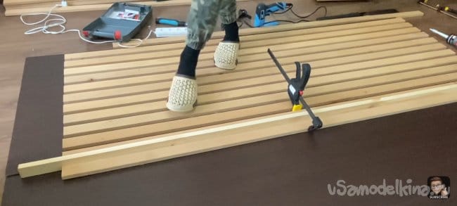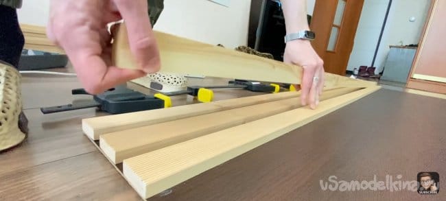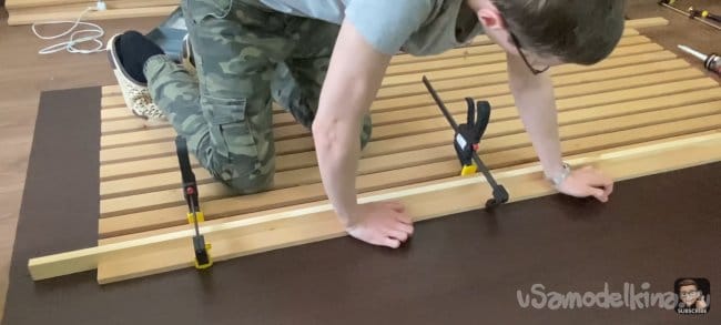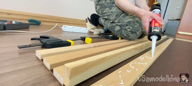 Наношу клей (жидкие гвозди) на всю длину планки и фиксирую ее на подложке с помощью струбцин! Для того чтобы панель не разваливалась я закрепил каждую планку скобами электрическим степлером с тыльной стороны ДВП. Для большей точности я использовал шаблон толщиной 18 мм, который я прокладывал между каждой следующей планкой. Фиксирую их вместе струбцинами.