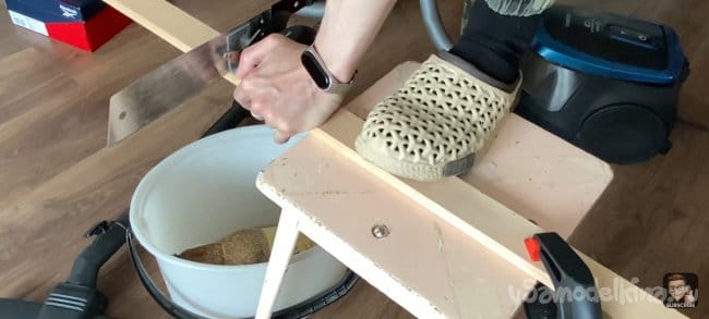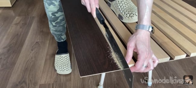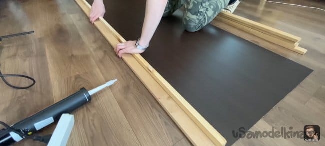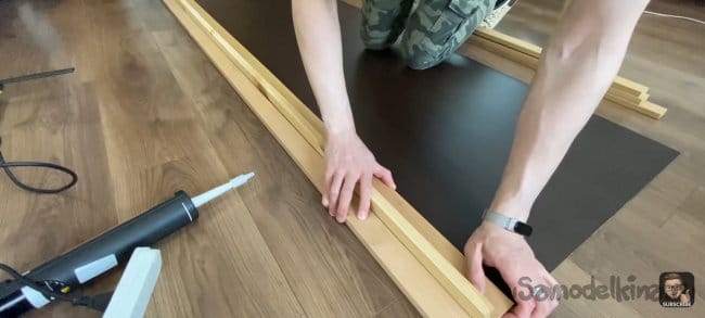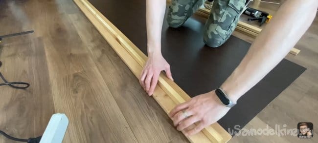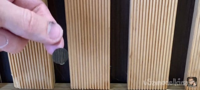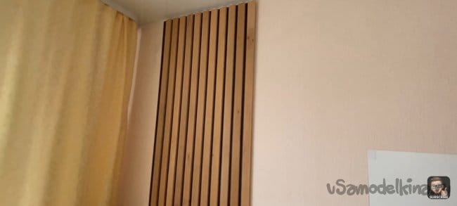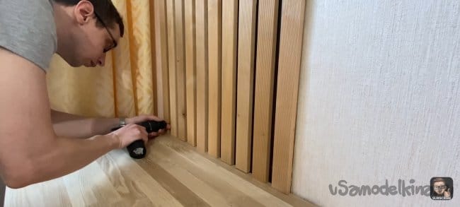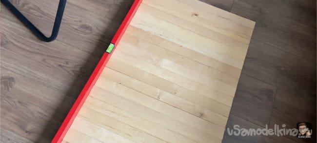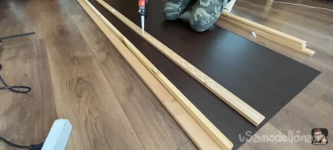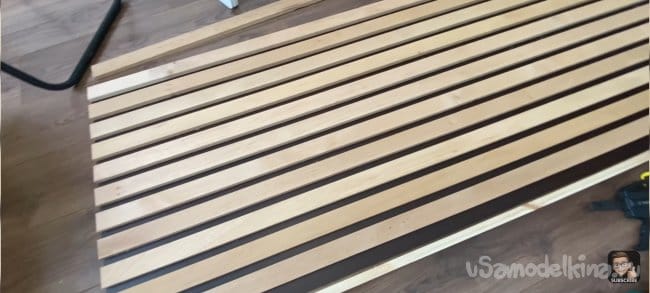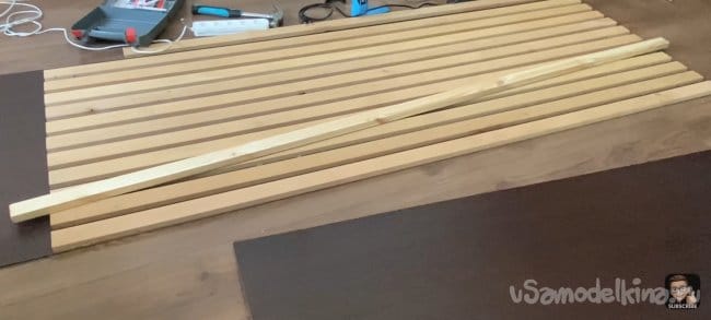 Я всё измерил и отпилил планки до нужной мне длинны. Затем взял лист ДВП и примерил на нём планки. Зазор между ними 18 мм. Мне кажется, это идеальный зазор, для того чтобы была видна подложка и при этом темный цвет хорошо контрастировал с деревом.