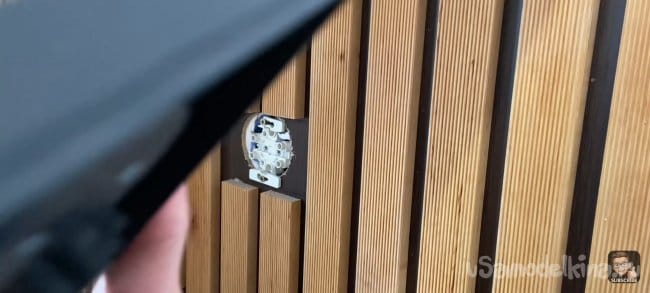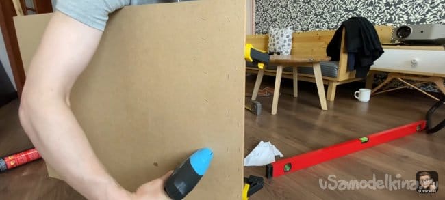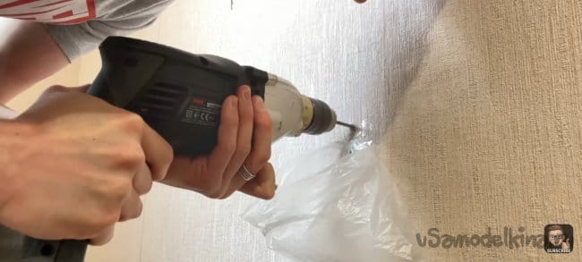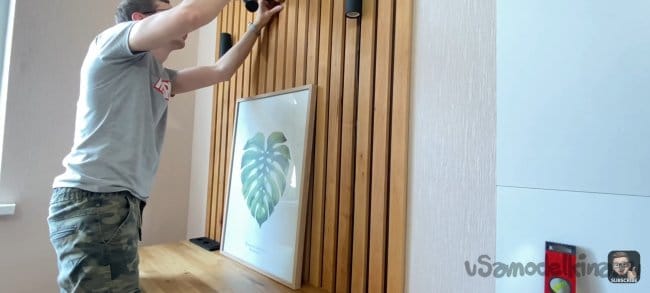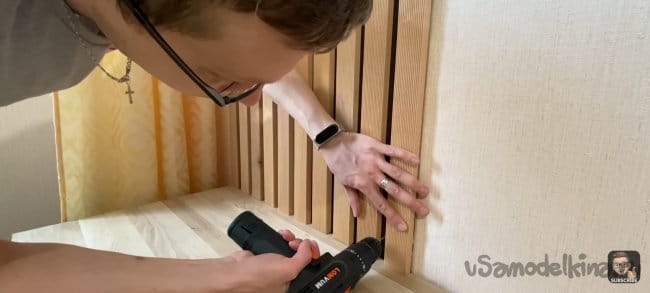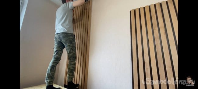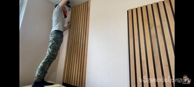 Тут всё просто! Размечаем места крепления и сверлим отверстия в панели. После прикладываем к стене и отмечаем точки для сверления. Сверлим и крепим к стене на дюбель-шуруп. Сами шляпки я заклеил декоративными заглушками на клеевой основе.