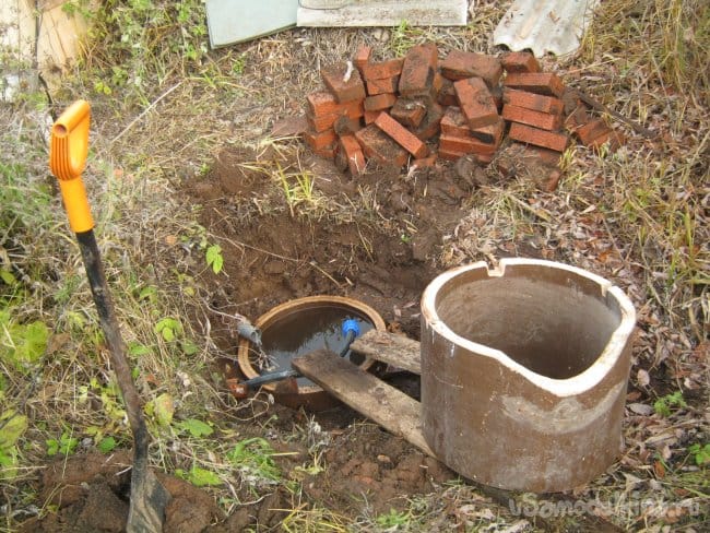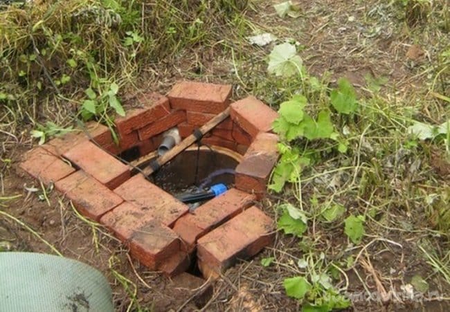 Накопительный колодец расположен ниже уровня окружающего грунта, импровизированная горловина выложена из нескрепленных раствором кирпичей (Фото 5).