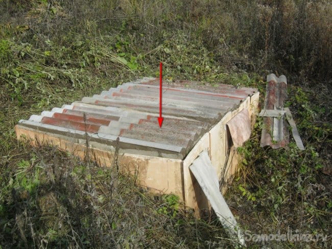Фото 8. Готовое перекрытие из асбоцементного шифера, стрелкой показан инспекционный люк.