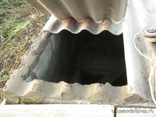 Листы шифера примерил и уложил с перехлестом, приготовил цементно-песчаный раствор, по одному приподнимал листы, на бетонный бортик – торец стенок камеры укладывал более-менее ровный валик цементной смеси и опускал лист на место. Выдавленные остатки заделывал мастерком в волны и края листов, так, чтобы не оставалось щелей. В сапогах и с налобным фонариком влезал внутрь камеры и на импровизированных подмостках заделывал стыки и волны изнутри.