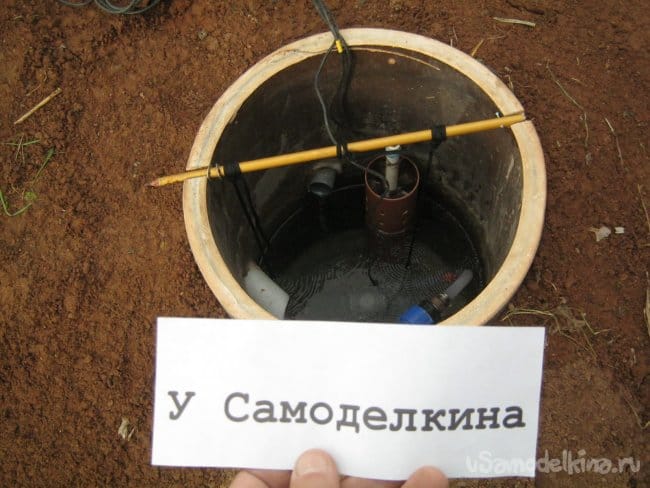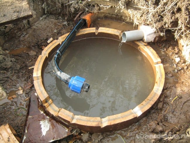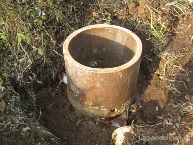 Пользоваться родником разумно было только при применении насоса – большой перепад высот, ведром не наносишь. То есть, нужно было собирать воду с разрытого участка и накапливать ее в некой емкости. Моя емкость представляет собой кусок керамической мелиоративной трубы Ø 500 мм и такой же примерно высоты, с забетонированным дном (Фото 1).