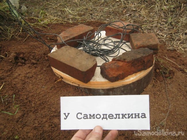 На следующий день, когда немного схватился цементный раствор, заделал оставшиеся щели, установил насос, блок датчиков уровней воды, обваловал горловину грунтом и из старого строительного пенопласта вырезал крышку.