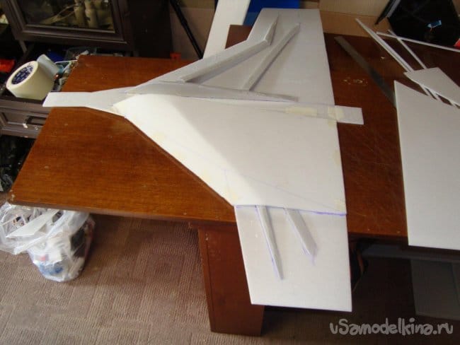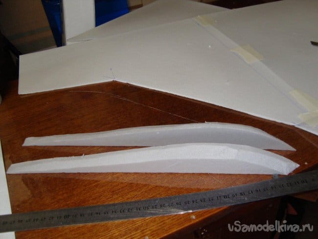 Вырезал корневые нервюры, которые для прочности решил сделать из листового утеплителя "Пеноплекс" толщиной 20 мм.