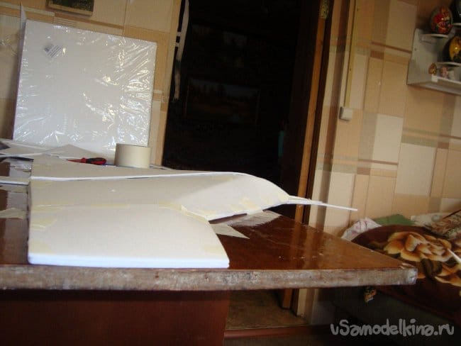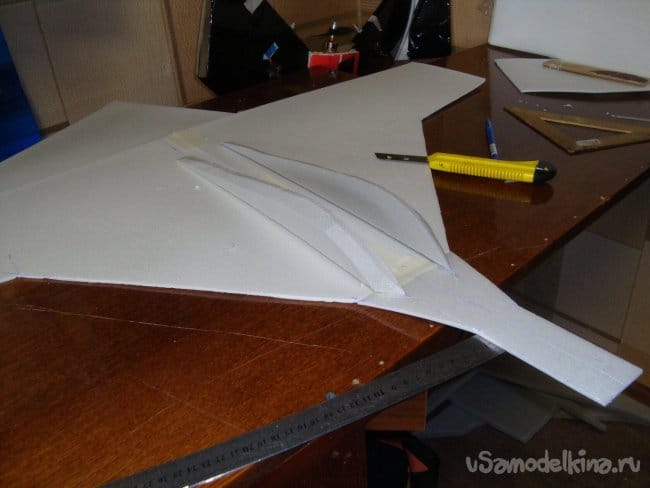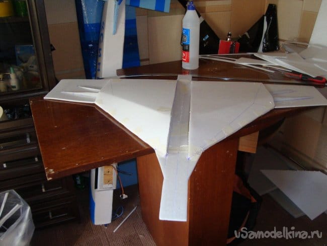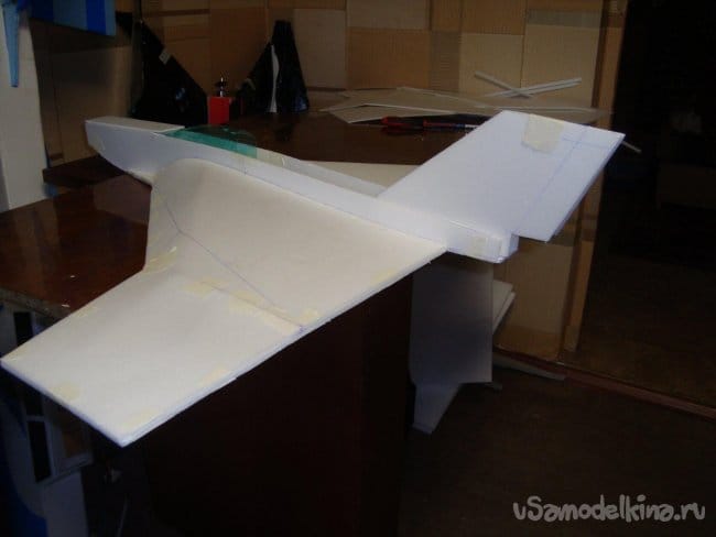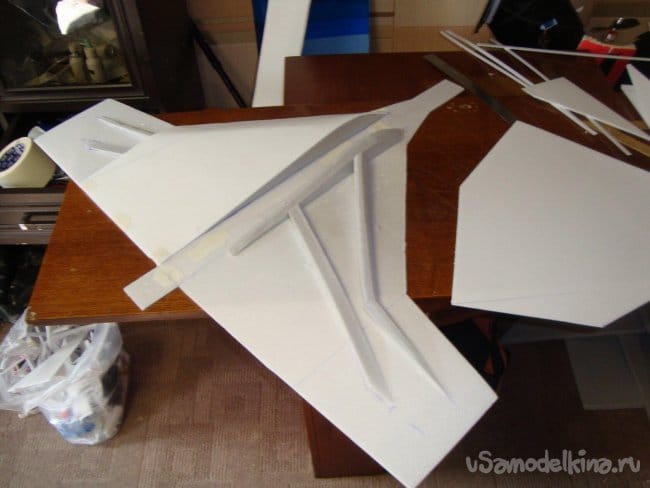 Вклеил заготовки боковых стенок фюзеляжа, примерил заготовки для киля, который склеивается из двух слоёв потолочки, примерил заготовку для кабины, которую изготовил из пластиковой бутылки. Не буду повторяться, я уже показывал этот процесс.
