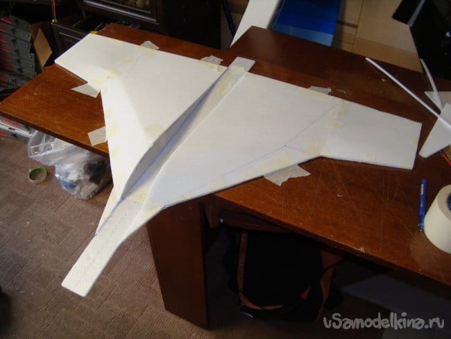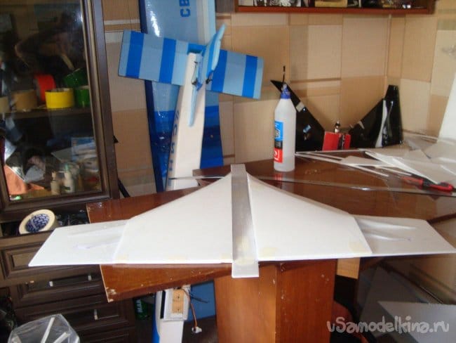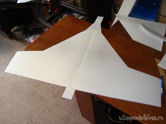 Поскольку я решил делать модель с объёмным крылом я вырезал в первую очередь нижнюю. несущую плоскость крыла, вернее две его половинки, которые склеил в единое целое.