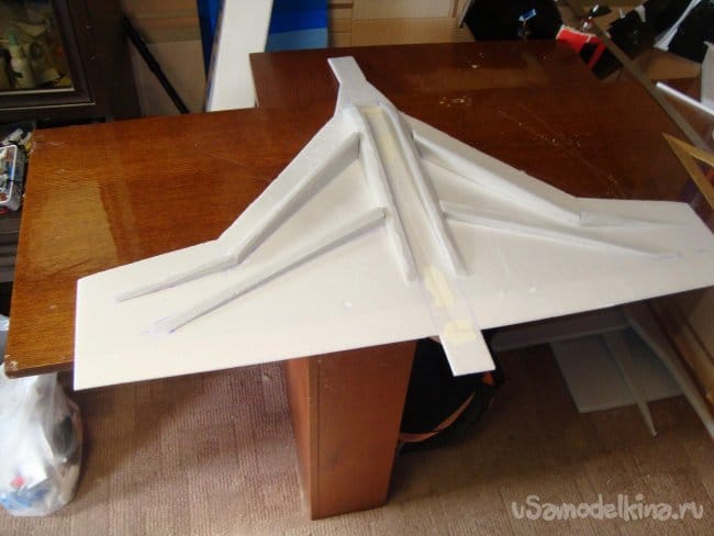 На нижнюю плоскость крыла, для прочности ,вклеил несколько лонжеронов, которые так же вырезал из кусочков листового утеплителя "Пеноплекс" , толщиной 20 мм.
