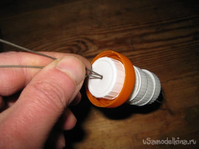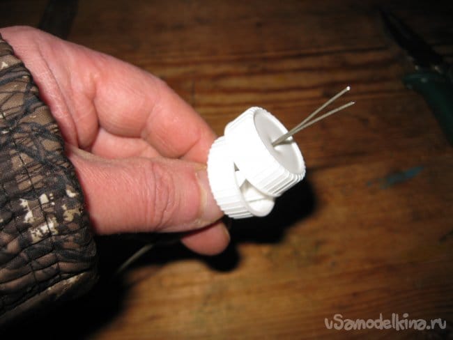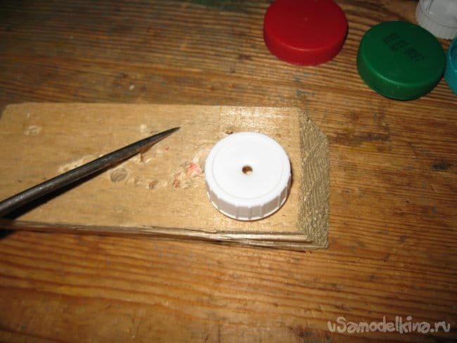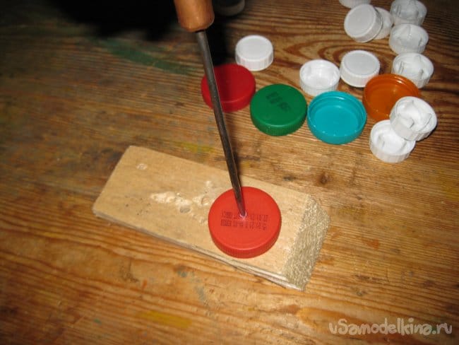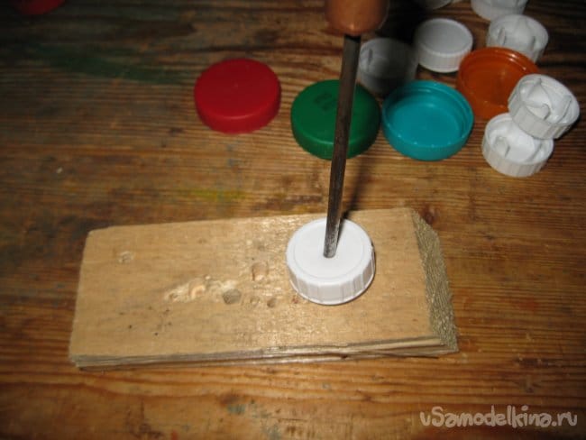 Шаг 1. При помощи шила, прокалываем отверстия в центре каждой пластиковой крышки для последующего их насаживания на проволоку.