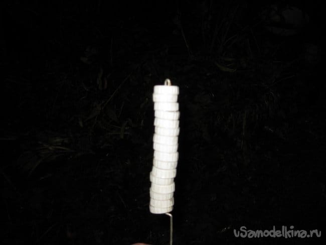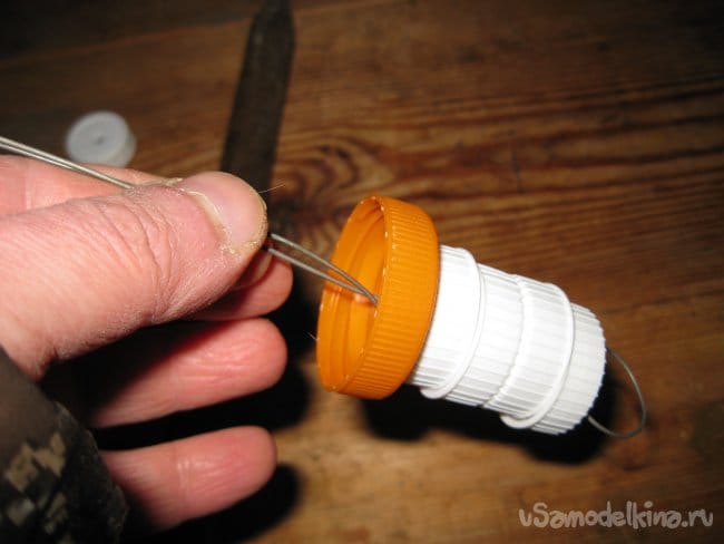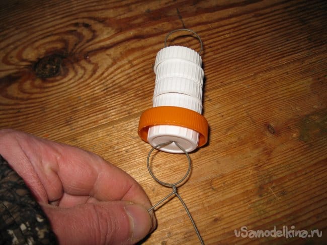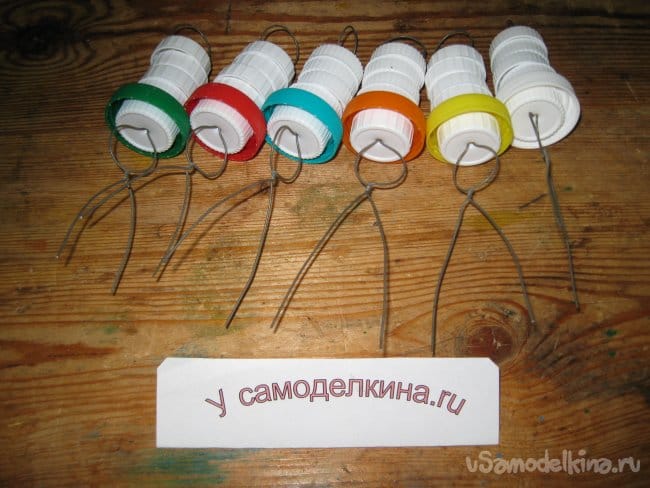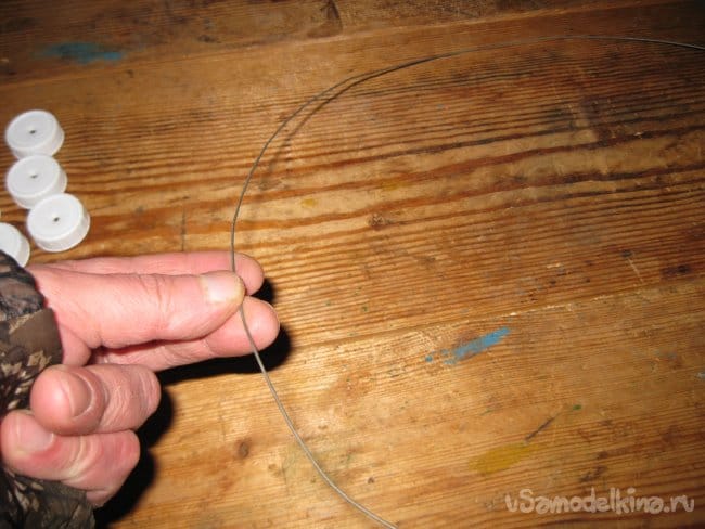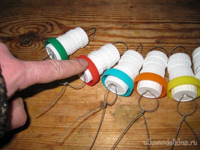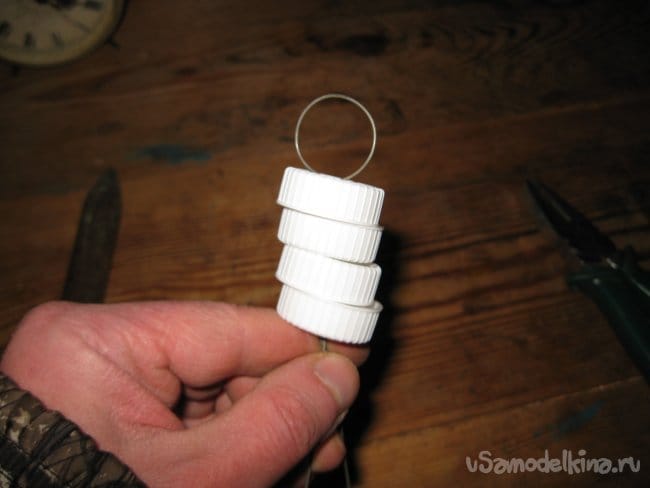 Шаг 4. Сведя кончики проволочной заготовки вместе, начинаем нанизывать на них белые пластиковые крышки.