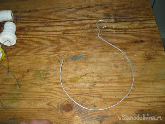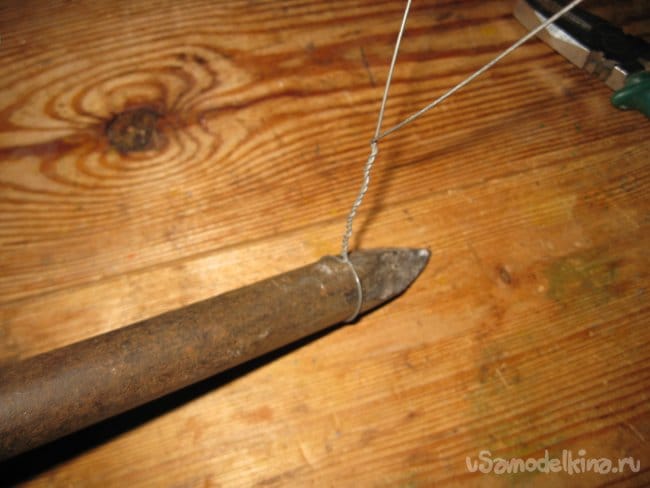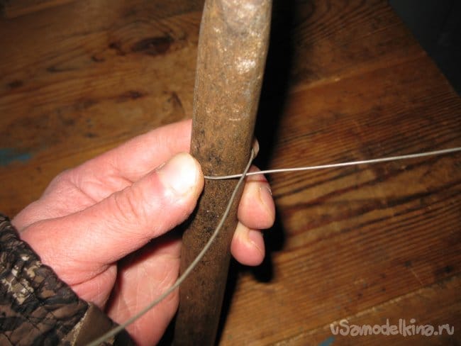 Шаг 2. Кусачками откусываем от мотка, отрезок проволоки длиной 45-50 см, а затем прикладываем этот отрезок серединой к костылю, который будет служить нам в качестве оправки, и оборачиваем вокруг него.