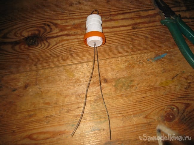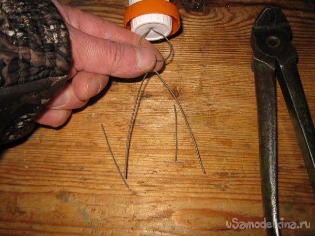 Шаг 6. При помощи кусачек, слегка укорачиваем проволочные ножки нашей метки до длины 7-8 см, а заодно делаем их одинаковыми по длине.