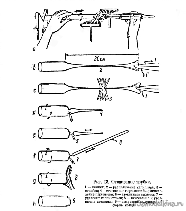 Рис.1. Последовательность действий при изготовлении донышка пробирки [1]. Обратите внимание на интересную стеклодувную горелку «американской» системы – со встречным пламенем (Рис. а)