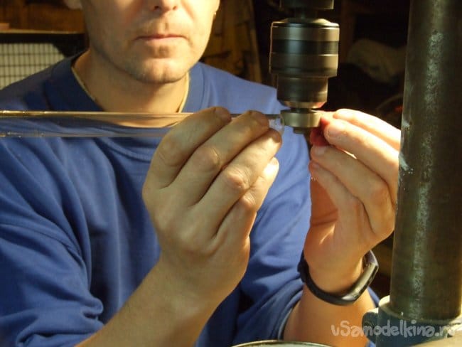 Заготовки – по случаю мне досталось, увы небольшое, количество стеклянных трубок – именно остатков разорившегося неонового производства. Среди нескольких прочих, есть и немного трубок Ø 18 мм, хорошо подходящих для пробирок. Трубку-заготовку стандартной длины разметил спиртовым маркером и разрезал на равные куски. Такой диаметр всё ещё можно резать стеклодувным ножом, на манер вскрытия ампул – круговым движением нанести царапину, растягивая, разрывая трубку в стороны, сломать ее. Тем не менее, усилия требуются значительные, разломы не всегда удаются удовлетворительного качества – часто неровны. Случившиеся неровные края выравнивал на алмазном инструменте смачивая его водой (Фото 2).