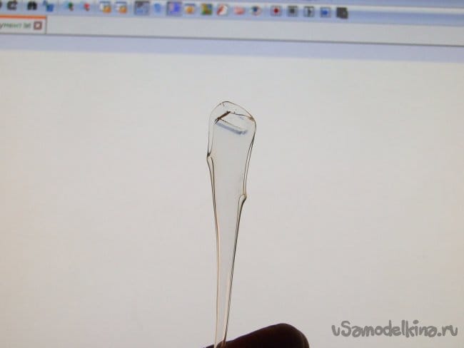 Фото 7. Стеклянная игла оставшаяся от пробирочных работ. Этот кусочек стекла подвергался сильным деформациям и внутренние напряжения содержит наверняка. При исследовании его невооруженным глазом – стекло как стекло.