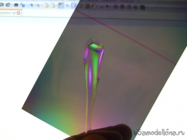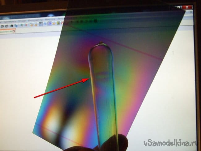 Для подсветки исследуемого образца выведем на ЖК монитор белый фон, например, создадим новый документ в редакторе «Блокнота» и откроем его. Работа поляризационного фильтра зависит от его положения, при наблюдениях приходится вращать его параллельно плоскости экрана до получения наилучшего изображения – отчетливо видимых фиолетовых пятен внутри образца, конечно если они есть.