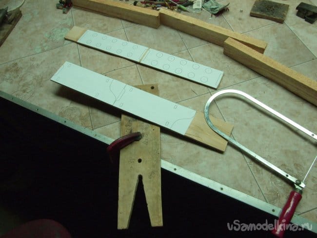 В деревянном хламе подобрались и отличные заготовки – нетолстые широкие пластинки из сухой березы – плотное, светлое и широко распространенное дерево в наших краях. Разве только слишком склонное к раскалыванию. Пластинки были примерены к шаблонам и сочтены пригодными. Отшлифовал их некрупной наждачной бумагой и погрунтовал разбавленным клеем ПВА, чтобы меньше влиял перепад влажности.