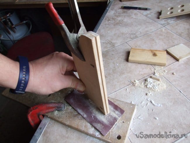 Выпиленные и освобожденные от бумажек детали состыковал шипами поработав плоским надфилем. В незаметном месте пронумеровал соединительные элементы, отшлифовал детали. Кривые и внутренние поверхности отверстий – свернутым в трубочку куском наждачки. Высоту ножек стенок штатива выровнял также, шлифованием на ровной твердой поверхности, временно скрепив боковые стеночки мощным нетяжелым зажимом (Фото 4).
