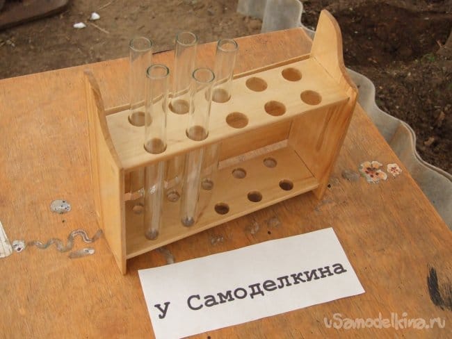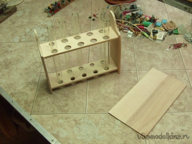 Все резы делал хрестоматийным лобзиком по дереву, в том числе и отверстия для самых пробирок – дерево тонкое и колкое, сверлить не годится. Внутренние контуры выпиливал как обычно – сверление внутри некрупного отверстия, продевание пилочки, выпиливание. Сломал только одну да и то старую.