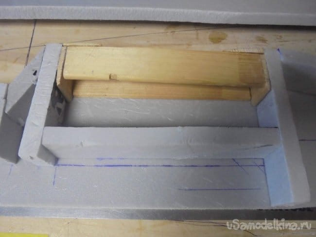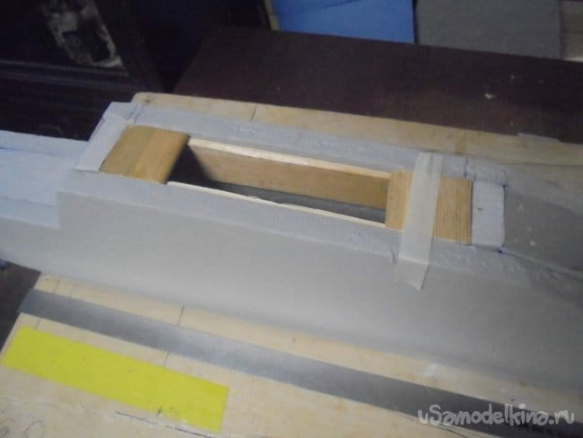 Вклеил внутренние перегородки и усилил место установки крыльев деревянными рейками сечением 30 х 6 мм.