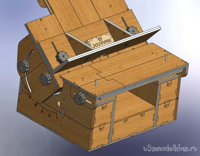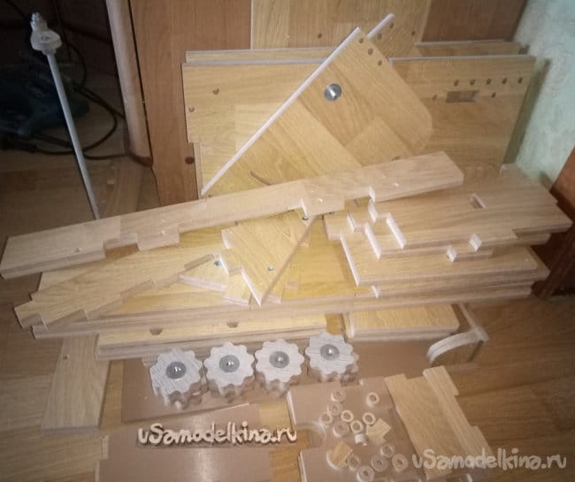 А тут идет дальнейшая сборка внутренностей стола. Вот тут и понадобился ящик для примерки. Все установилось просто замечательно. В проекте я заложил зазоры в 0,5мм, и при сборке могло например расслоить детали, и тогда бы было плохо. Но этого ничего не произошло.