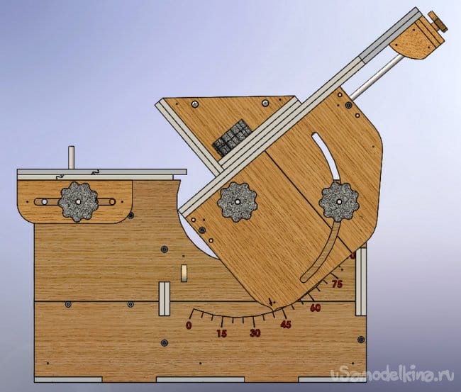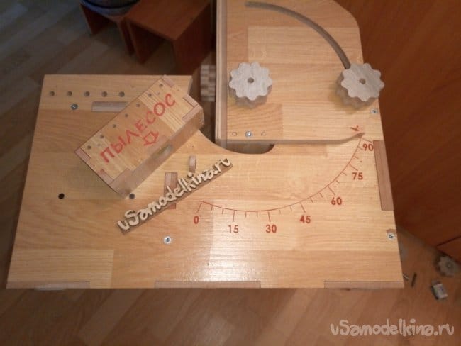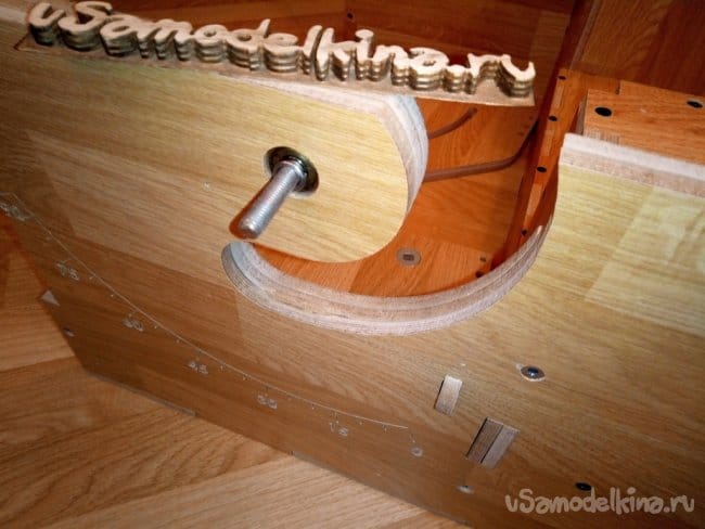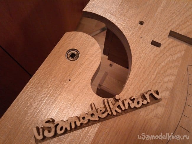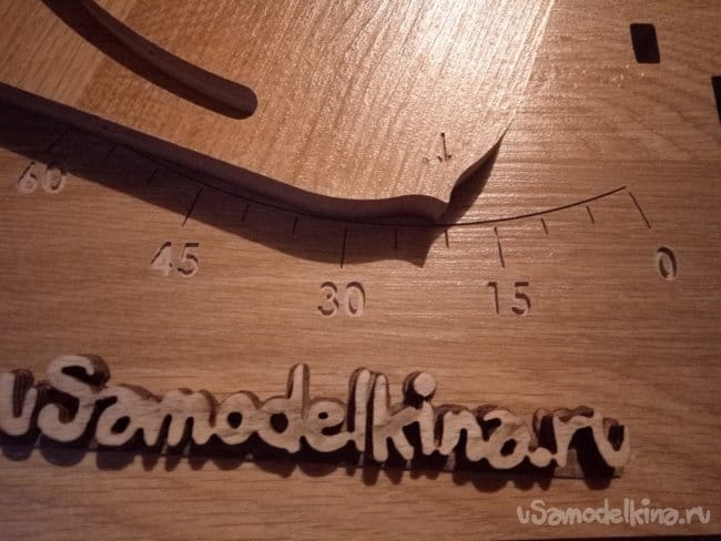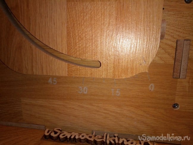 Предварительная примерка составного подвижного узла. На фотографии видно нанесенную угловую шкалу и указатель уровня угла. В дальнейшем всю гравировку я покрасил. Просто добавил в клей ПВА краситель на водной основе и втёр в гравировку. Излишки просто уделил влажной тряпкой.