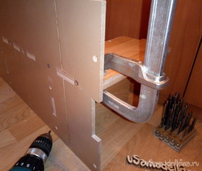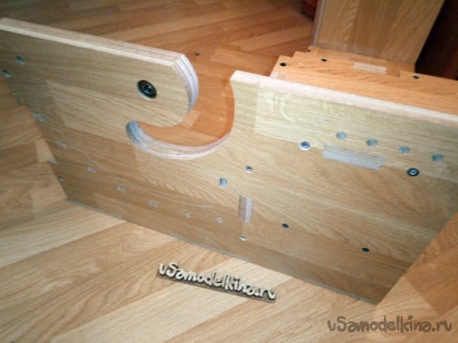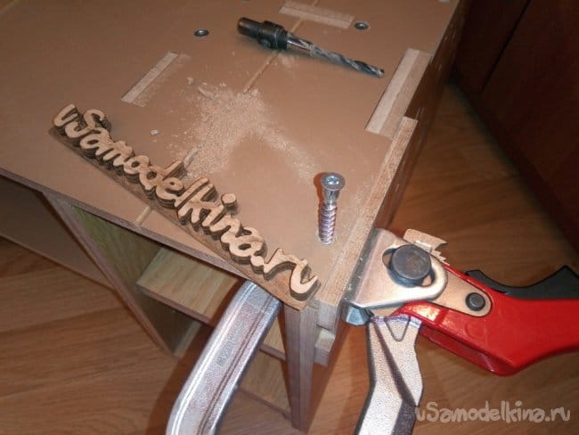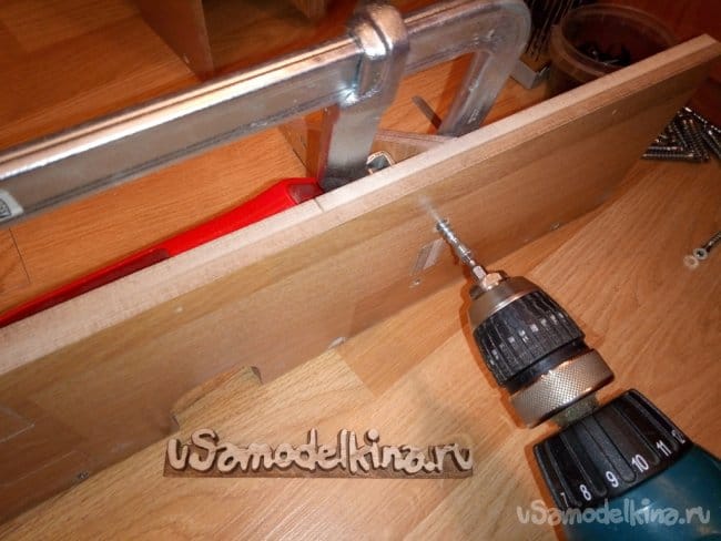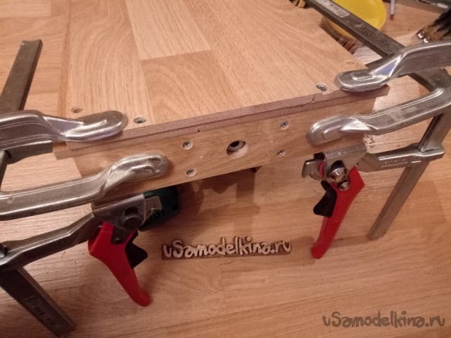 После высыхания отдельных деталей собираю их дальше между собой. Для крупных соединений уже использую саморезы, шканты 6мм и винты-конфирматы. Так же места соединений смазываю клеем и стягиваю струбцинами. При закручивании винта-конфирмата конечно же засверливаю спецсверлом, а место где будет установлен конфирмат стягиваю струбциной во избежании расслоения склеенных половинок детали.