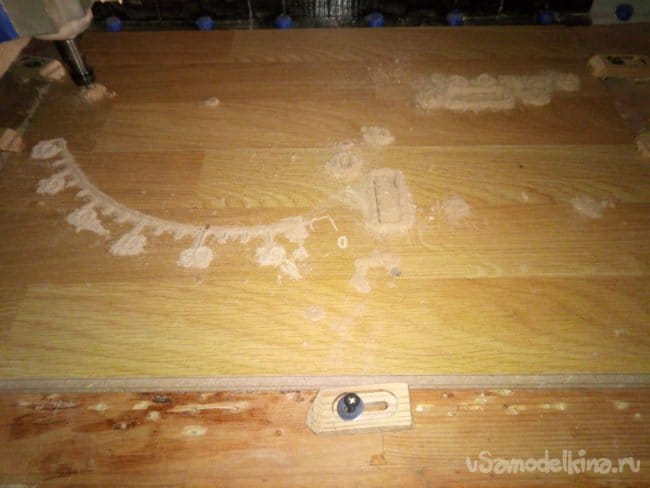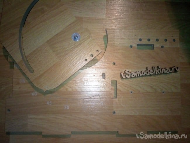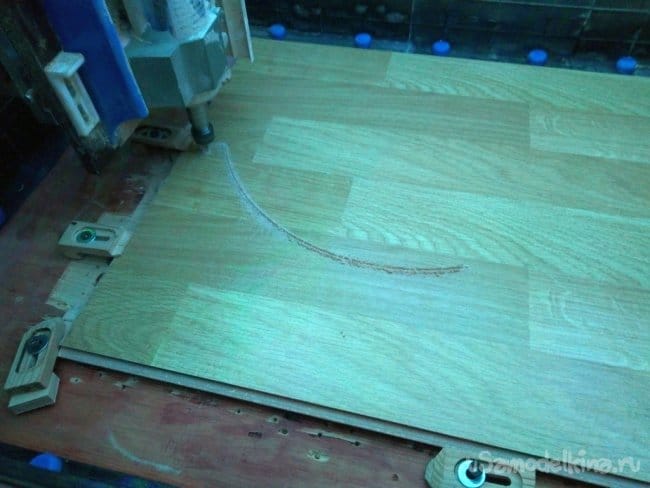 На следующих фотографиях видно процесс вырезания и гравировки. Детали большие по размеру и что бы их изготовить я предварительно собрал ламинат используя родные замки и склеив стык клеем ПВА. Так как готовые детали будут состоять из двух частей, я постарался на листе расположить детали таким образом, что бы при склеивании половинок швы находились как можно дальше друг от друга. На фотографиях дальше это будет видно.