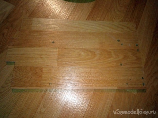 А это самая большая деталь. Основание стола. На нем будут монтироваться все остальные детали. Состоит аж из четырех полос ламината. Самое сложное было правильно выставить материал что бы в итоге получить правильную формы и размеры.