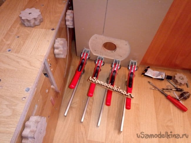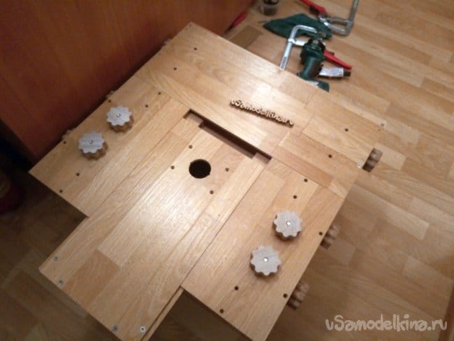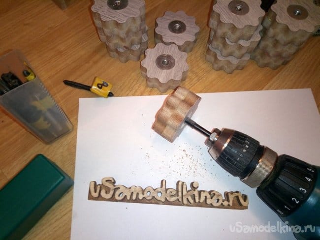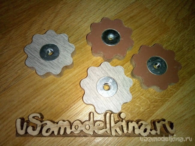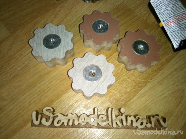 Ниже показан процесс изготовления барашков. Их вырезал из обрезков ламината 12мм. Внутрь впрессовал по гайке М8 и закрыл широкополой шайбой. Для крепости под гайкой и шайбой смазал клеем ПВА. Все-таки материал - прессованная бумага.